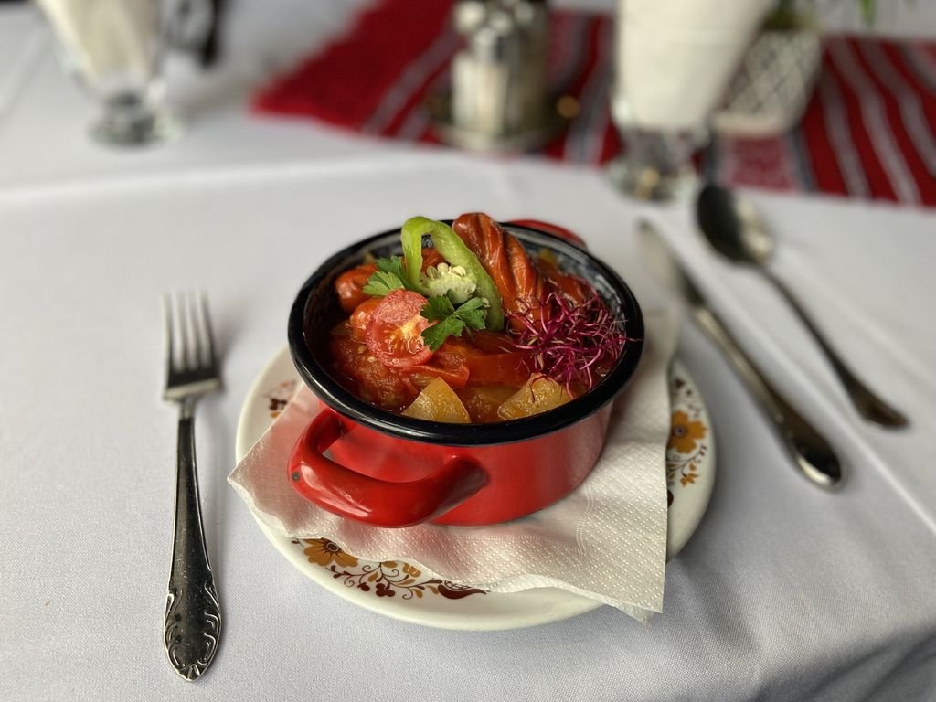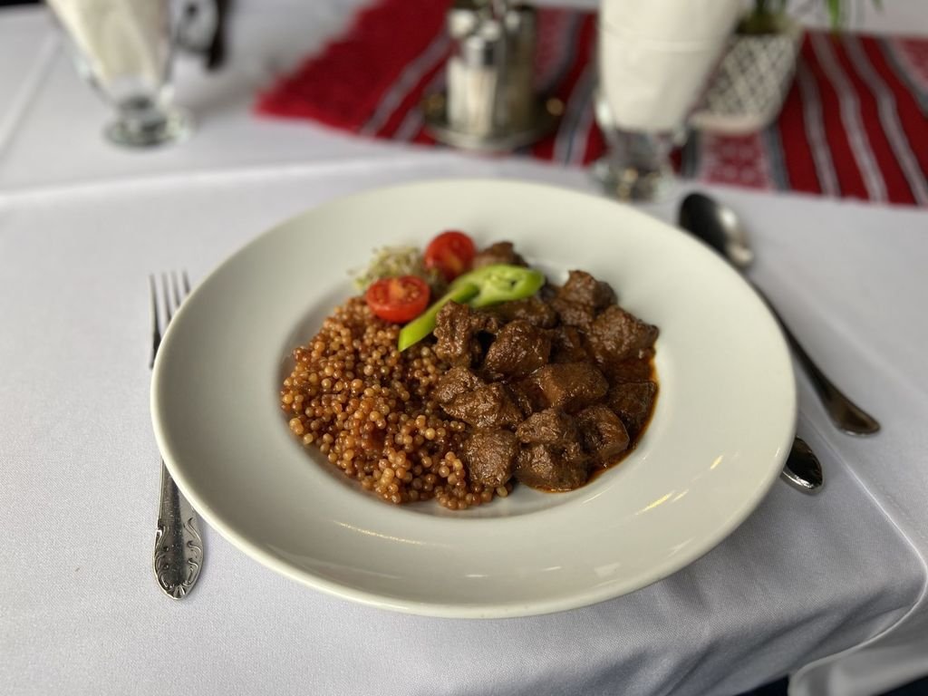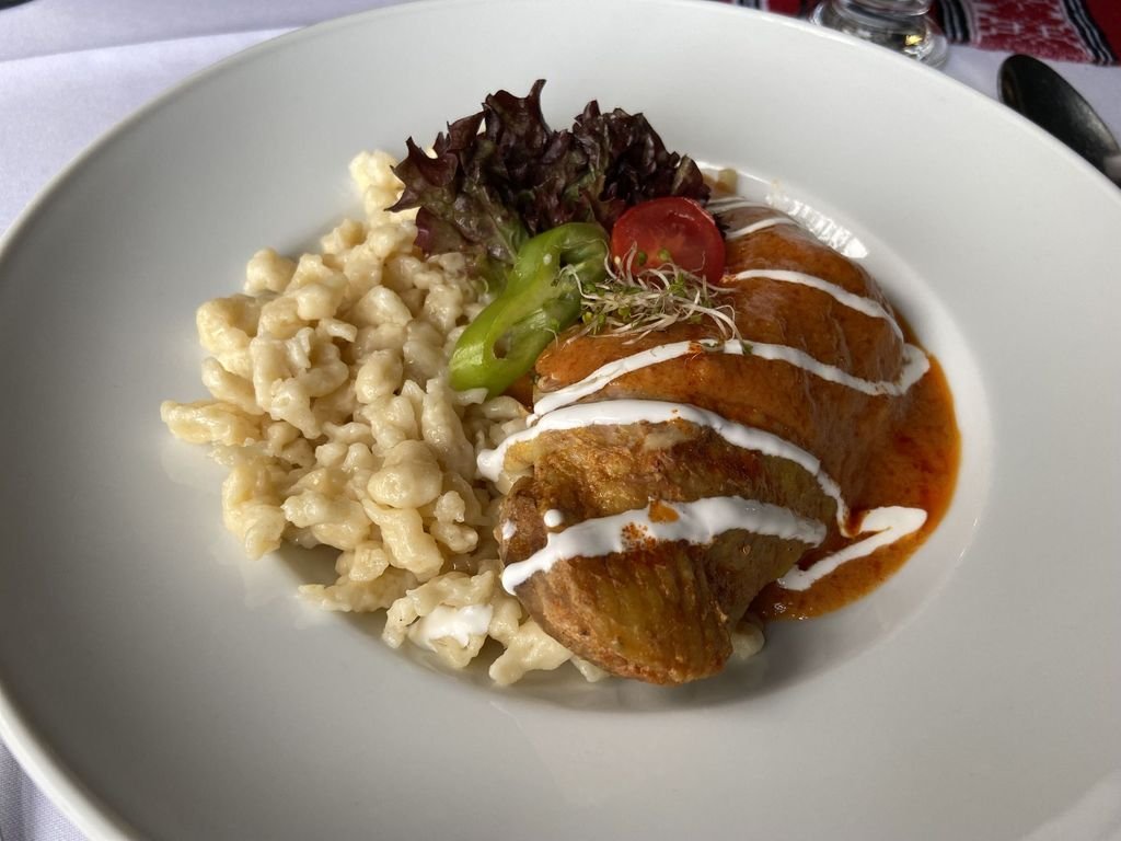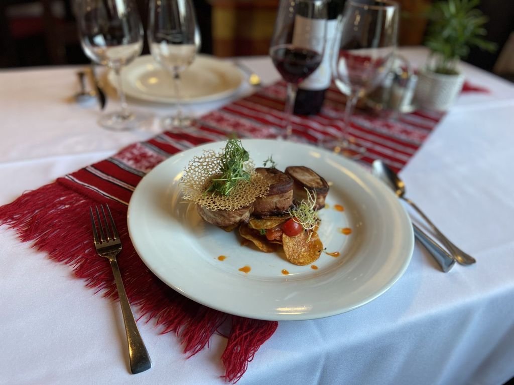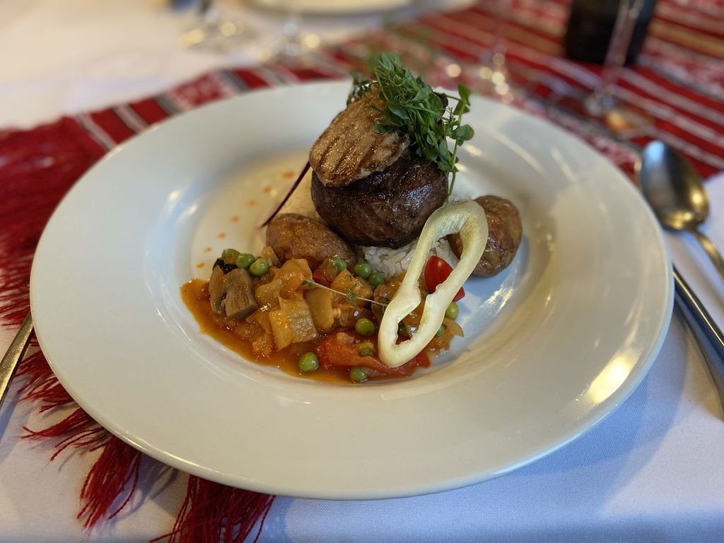 Bélszín Budapest módra (lecsóval, zöldborsóval, libamájjal)